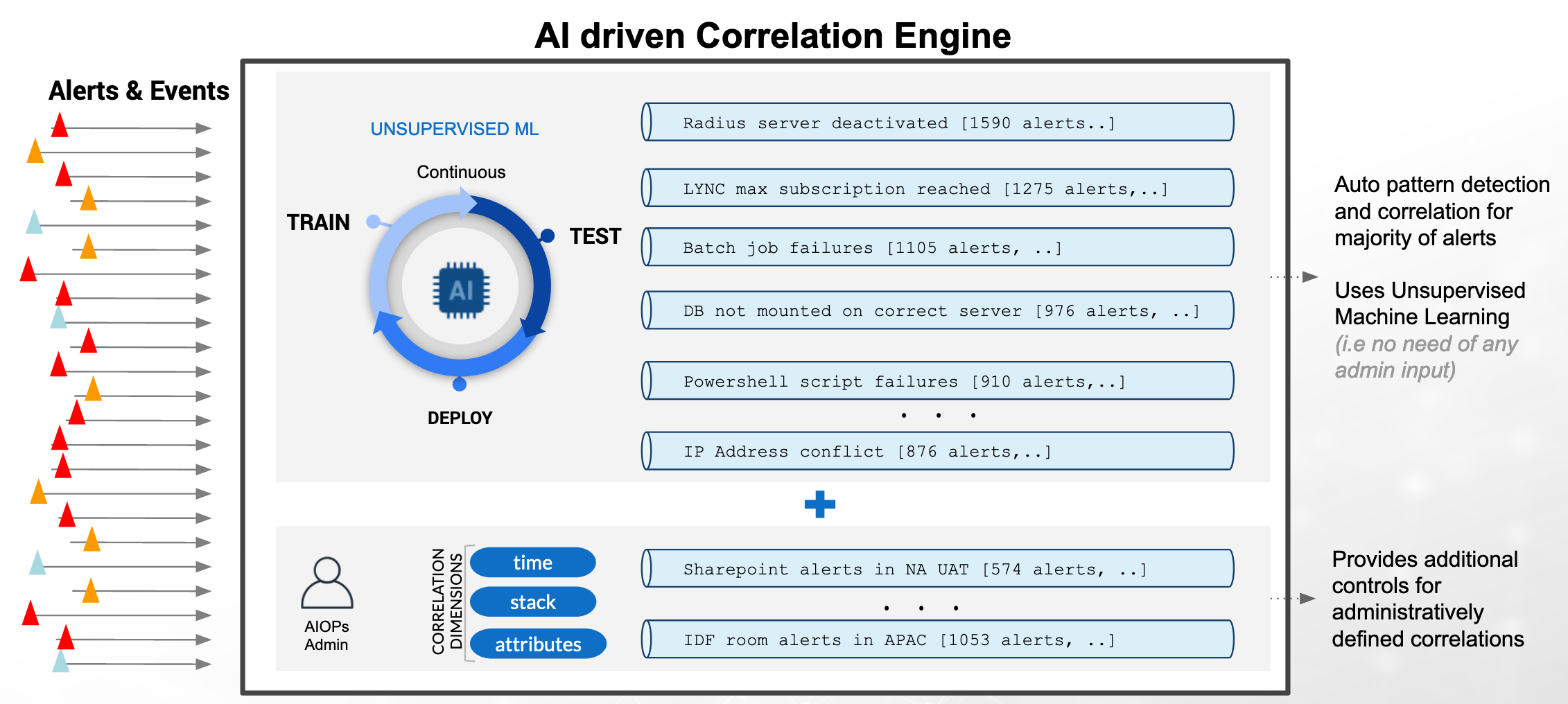 OIA leverage ML to drive majority of alert correlations. OIA detects various alert problems or symptoms in alert or event data and automatically starts correlating future incoming alerts based on these patterns. OIA uses unsupervised machine learning algorithms that remove stop words, identities etc. (de-variablization) and then tries to form clusters based on alert message. OIA also allows AIOps admin to further narrow down scope of alert symptom correlations to a particular application, stack or an infrastructure layer.