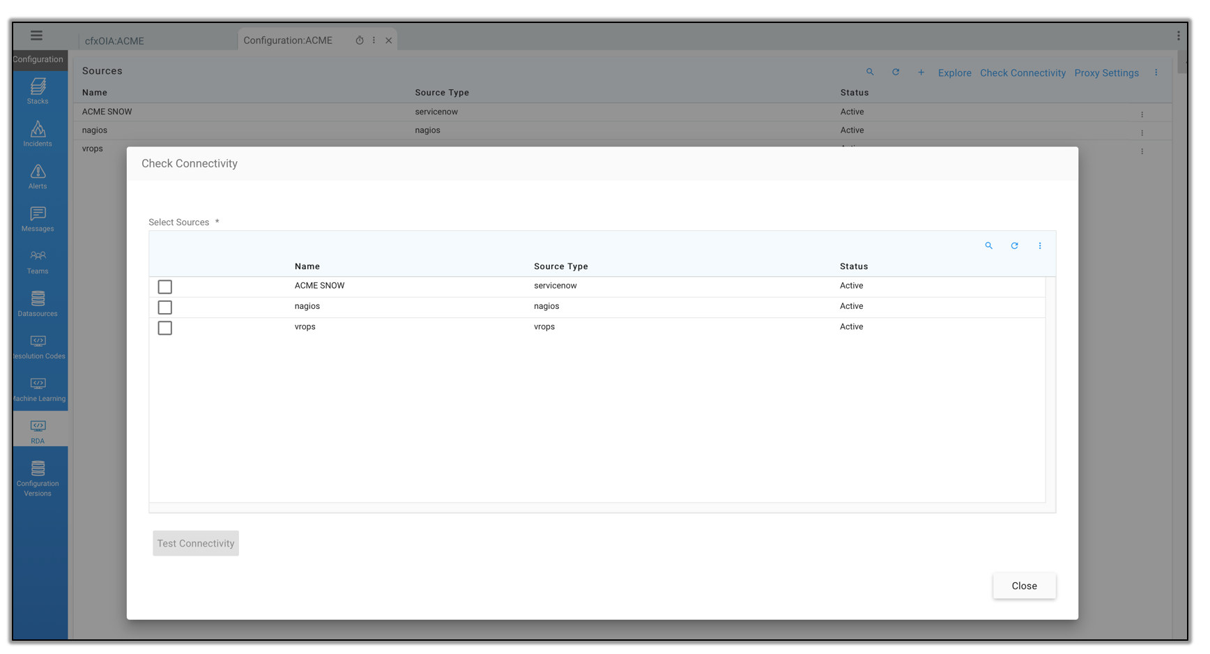 Users can click the 'Check Connectivity' button on the top right-hand corner (as shown in the above screenshot) to verify connectivity. The following UI pops up when a user clicks the 'Check Connectivity' button prompting users to select the target data source connectivity verification.