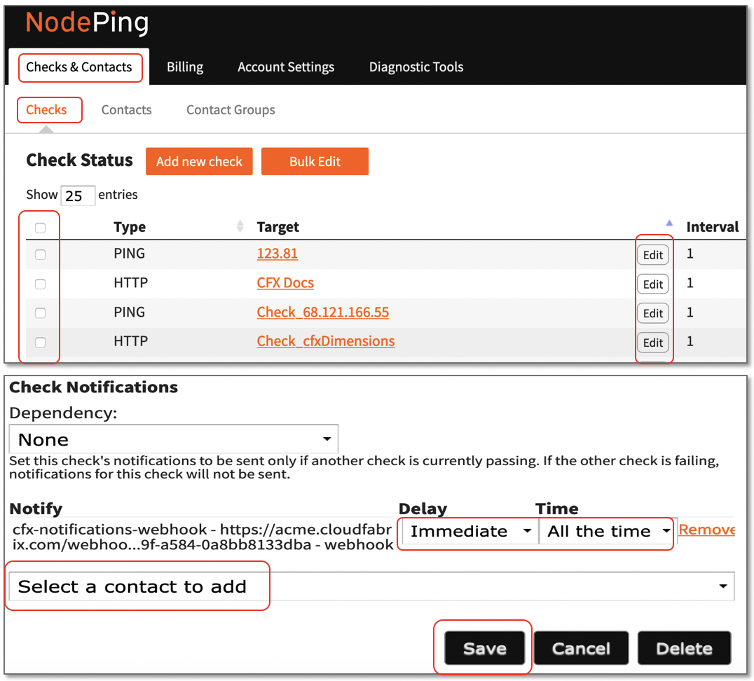 Step 5: Under 'Checks and Contacts', click on 'Checks', edit one or more monitored objects and under 'Notify' section, add the new Webhook that was created above to forward the alert notifications to CloudFabrix OIA application.